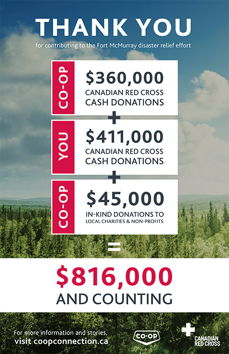 Following the devastating wildfire in Fort McMurray, Alta., local Co-ops across Western Canada — along with their members and customers — teamed up to contribute more than $816,000 in support of the relief efforts.